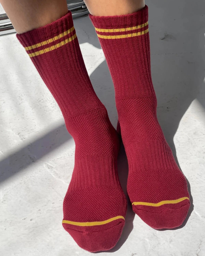 The Boyfriend Socks - a Le Bon Shoppe signature style - are the perfect mix of function and fashion creating an effortless sporty vintage charm sure to upgrade any outfit! This calf-height sport sock features a contrast double stripe, mesh top for breathability, and elastic arch support. Wear with boots, sneakers, or pool slides - do your thing baby! The Boyfriend Socks are durable, comfortable, and perfect for pairing with any shoe.