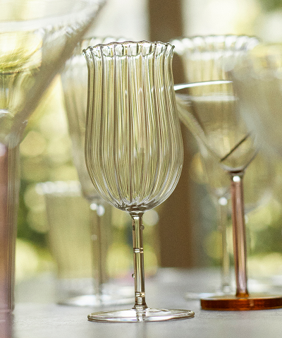 The Tulip Wine Glass is part of the Bouquet Collection, a five-part stemware collection made out of borosilicate glass that blurs the boundaries between functional and decorative household items. With each glass’s bowl and brim fanning out like a flower head, the collection groups together like a bouquet of wildflowers – each shape specific to a particular type of drink yet united in its ability to be arranged side-by-side in a harmonious collection.