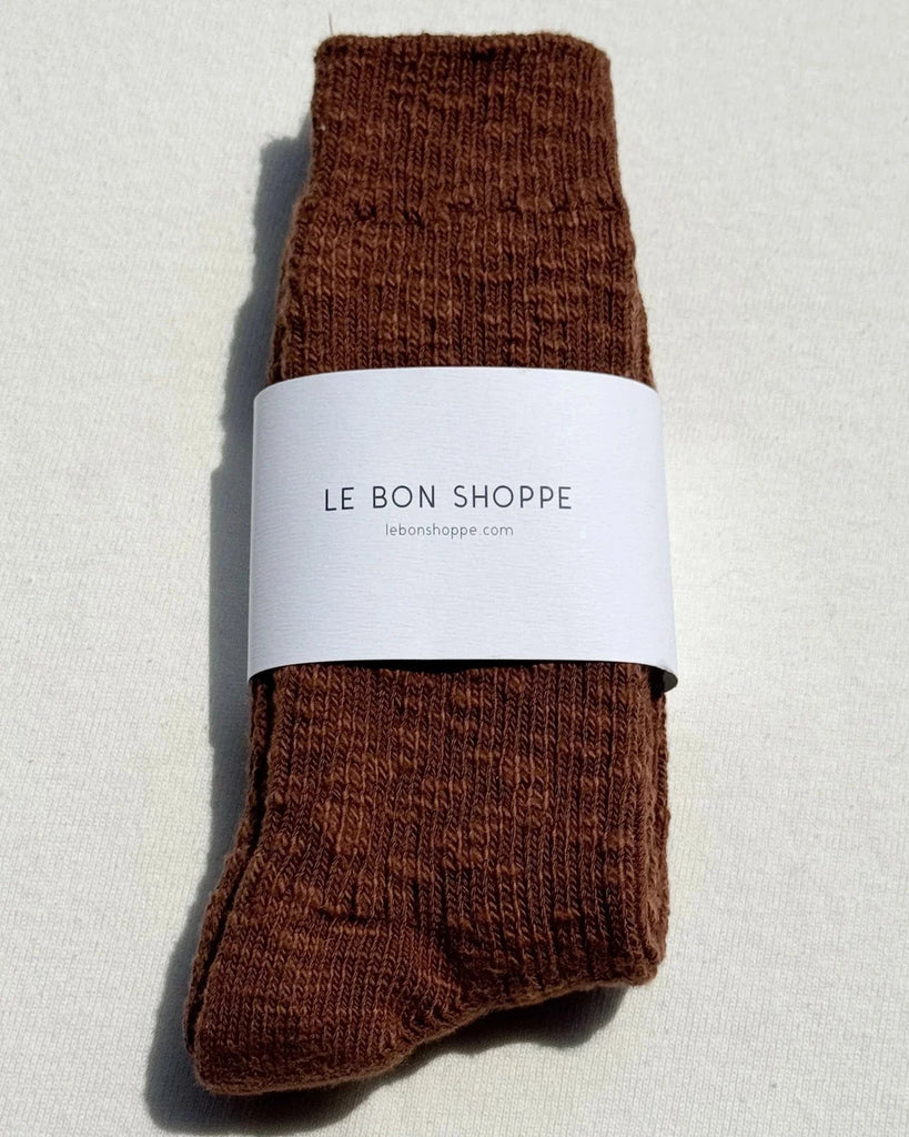 The Cottage Socks - made from a natural cotton blend - are a beautifully effortless sock that evokes feelings of wabi sabi and slow living. They feature a rich texture, muted color palette, thick ribbing and organic scrunching that feels romantically rustic. Pair these dreamy knit socks with vintage florals and tonal layers of luxurious natural fibers.